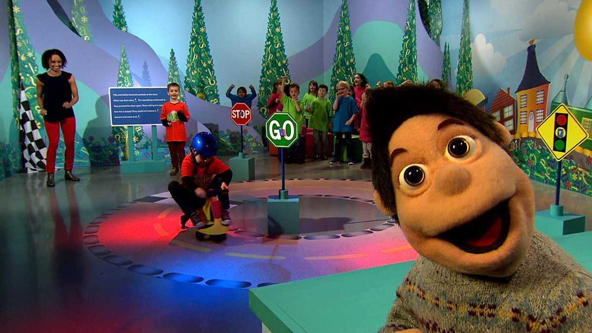 Short paragraph with missing punctuation (capital letter, full stop, question mark and exclamation mark). Contestants cycle around the track to collect 4 missing punctuation marks. Together in pairs, the contestants insert the punctuation into the spaces in the paragraph. When contestants make errors, the correct answers are shown. There are 2 paragraphs to punctuate. Contestants show some understanding of proofreading to check that their answers make sense.