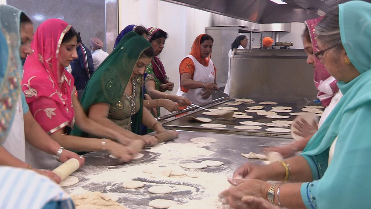 There are many symbols of respect which include taking off your shoes, washing your hands, covering your head, sitting down on the floor to eat, expressing equality through sharing food without taking notice of differences of gender, wealth, age or any other differences. Every Gurdwara has a kitchen, the famous ‘Langar’ where anyone can eat, just as long as they are willing to eat with everyone else. This helps to feed the poor and needy – and to challenge the wealthy and proud, if they need challenging! Some Sikhs take langar onto the streets as well to feed the homeless.