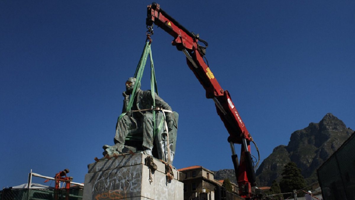 Photo: A statue of British colonialist Cecil Rhodes is tied by straps to a crane, before its removal from the University of Cape Town, 9 April 2015. South Africa's oldest university voted on April 8 to remove the monument from its campus after a month of student protests against a perceived symbol of historical oppression. (RODGER BOSCH/AFP/Getty Images)