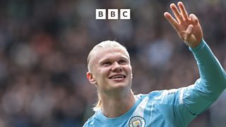 Erling Haaland reacts to his hat-trick in Man City's 4-0 win against Liverpool.