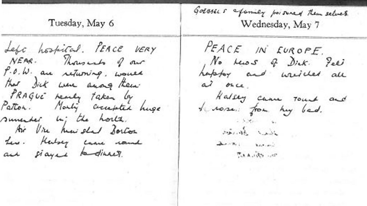 Rozanne Colchester, who lives near Banbury in Oxfordshire, reads her diary entry from the day peace in Europe was announced.