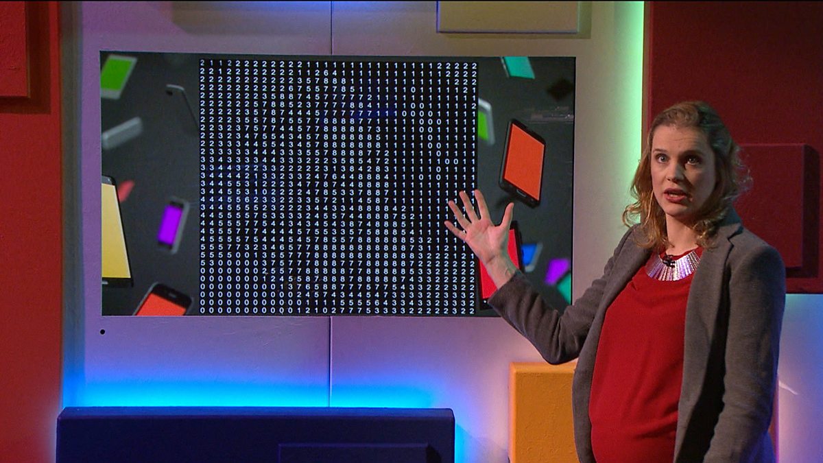 Professor Danielle George explains how a digital camera’s CMOS sensor captures an image, using balls and buckets to represent photons, electrons and capacitors in an interactive demonstration with 4 children. The demonstration shows that when a photon of light hits a pixel, the pixel releases an electron, which is stored by the capacitor. The more light that hits the pixel, the more electrons are released, and so the amount of charge in the capacitor is a measure of how bright that part of the image is. This measurement from the capacitor is then used to tell the image generator how bright that pixel should be. The demonstration shows how 4 children represent 4 pixels in a large image.