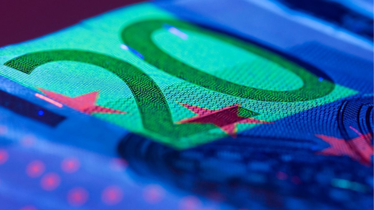 (Picture: 20 euro note glows under an ultraviolet light; Credit: Frans Dekkers/Thinkstock)