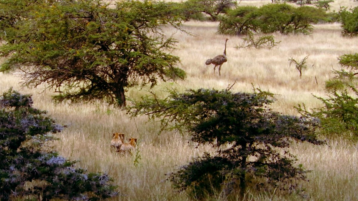An adult ostrich manages to outrun several cheetahs; but a juvenile is not so lucky.