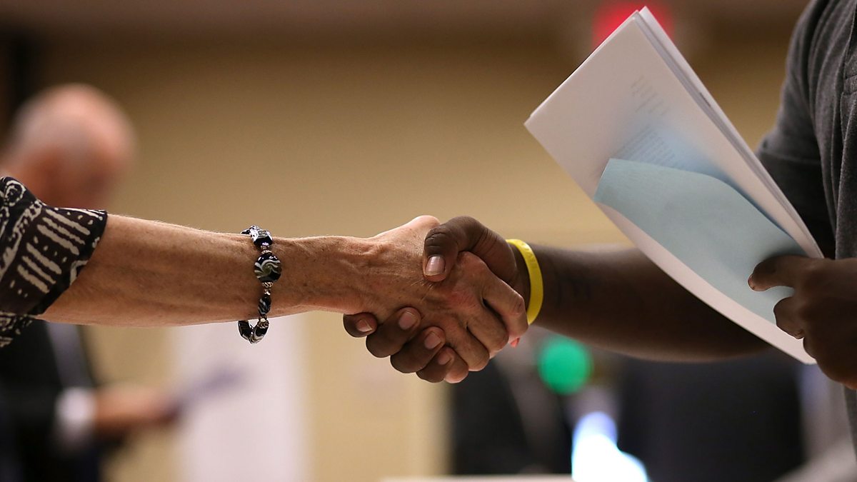 (Photo: A job seeker shakes hands with a recruiter during the East Bay's HIREvent in Emeryville, California, 2013. Credit: Justin Sullivan/Getty Images)