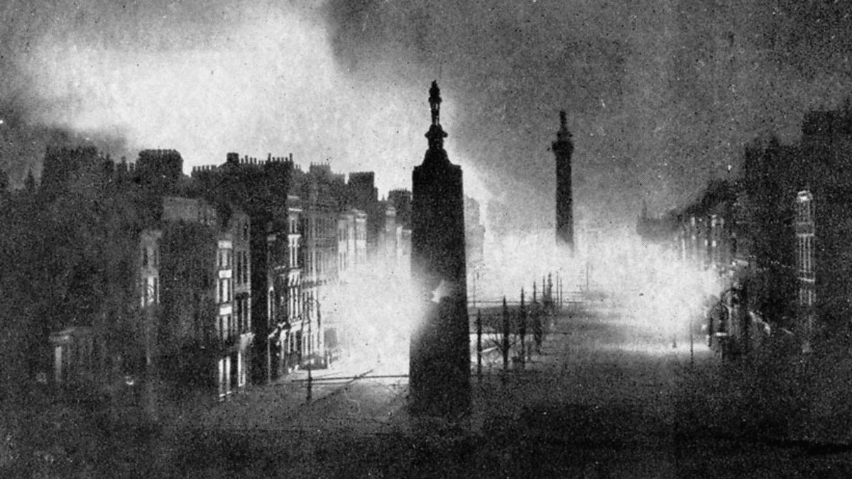 Image: Sackville Street in flames during the Irish rebellion in May 1916. Photograph courtesy of IWM