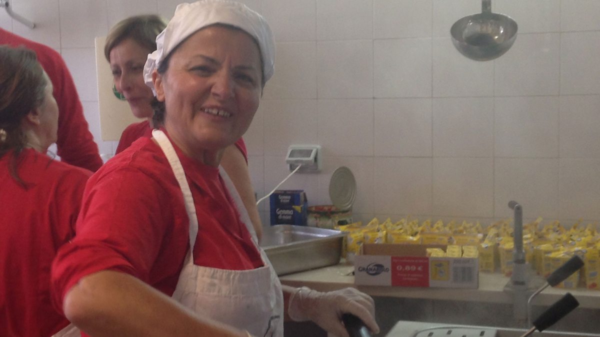 Housewife Maria Gratzia is a volunteer chef with a big heart and a big voice. Each week she doles out hundreds of kilos of pasta to the newly arrived migrants.