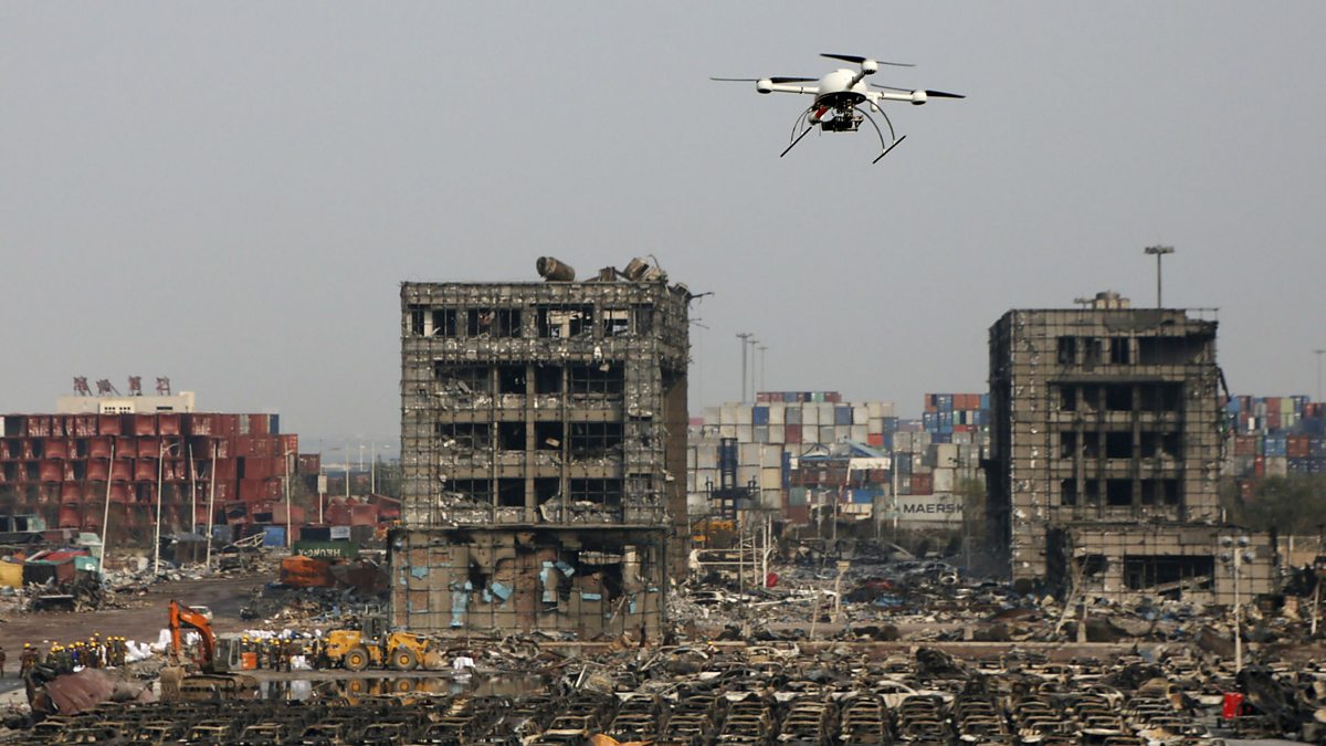 Picture: A drone flies over the site of explosions in Tianjin. Credit: Reuters / Kim Kyung-Hoon