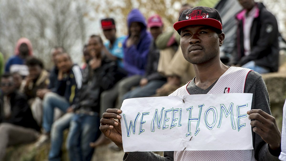 (Picture: A migrant holds a sign reading 'We need a home' in Calais/ Credits: Philippe Huguen/AFP/Getty Images)