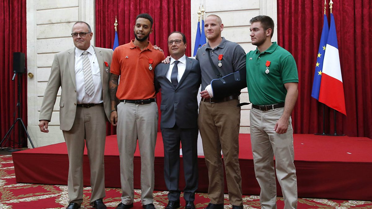 Image: French President Francois Hollande with Spencer Stone, Alek Skarlatos, Anthony Sadler and Briton Chris Norman where he presented them with the Legion d'honneur at the Elysee Palace. Credit: Reuters