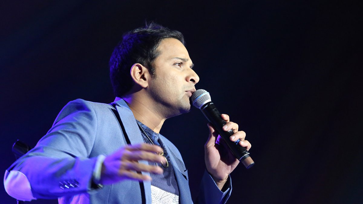 Singer Karthik talks to Haroon Rashid during AR Rahman concert at the O2 arena.