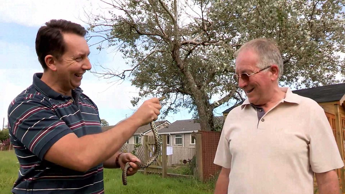 In response to an adder call out, Dr Rhys Jones discovers a grass snake hiding behind a brick. Rhys demonstrates the defence mechanisms of the reptile.