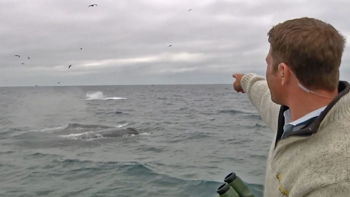 Steve Backshall is surrounded by feeding humpback whales in Monterey Bay.