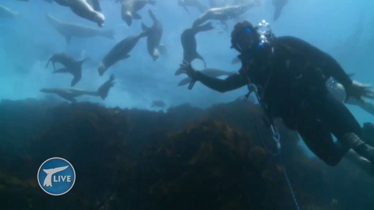 Steve Backshall dives into the waters of Monterey Bay, to swim side by side with Sea Lions.