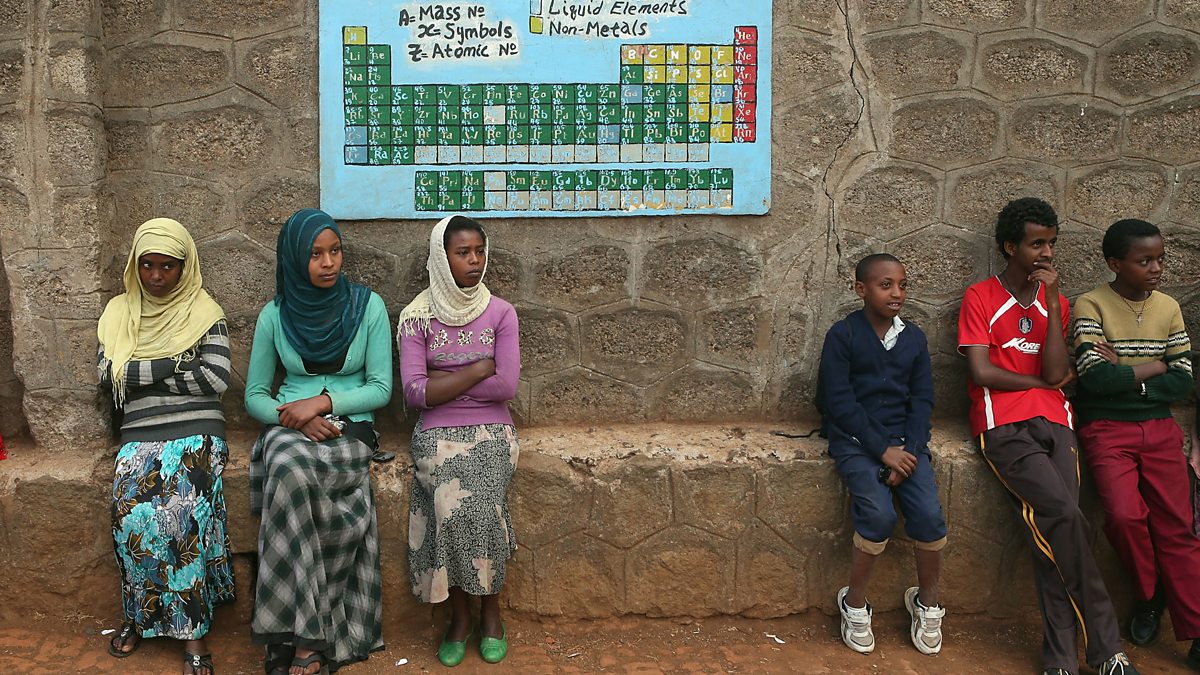 Photo: Secondary school students sit under the periodic table of the elements in the courtyard at a training centre and school in Addis Ababa, Ethiopia, 2013.