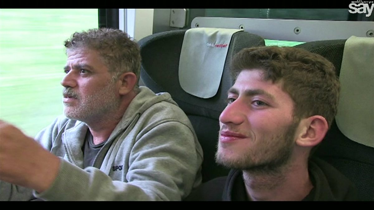 Syrian migrants discuss their situation with a stranger on a train