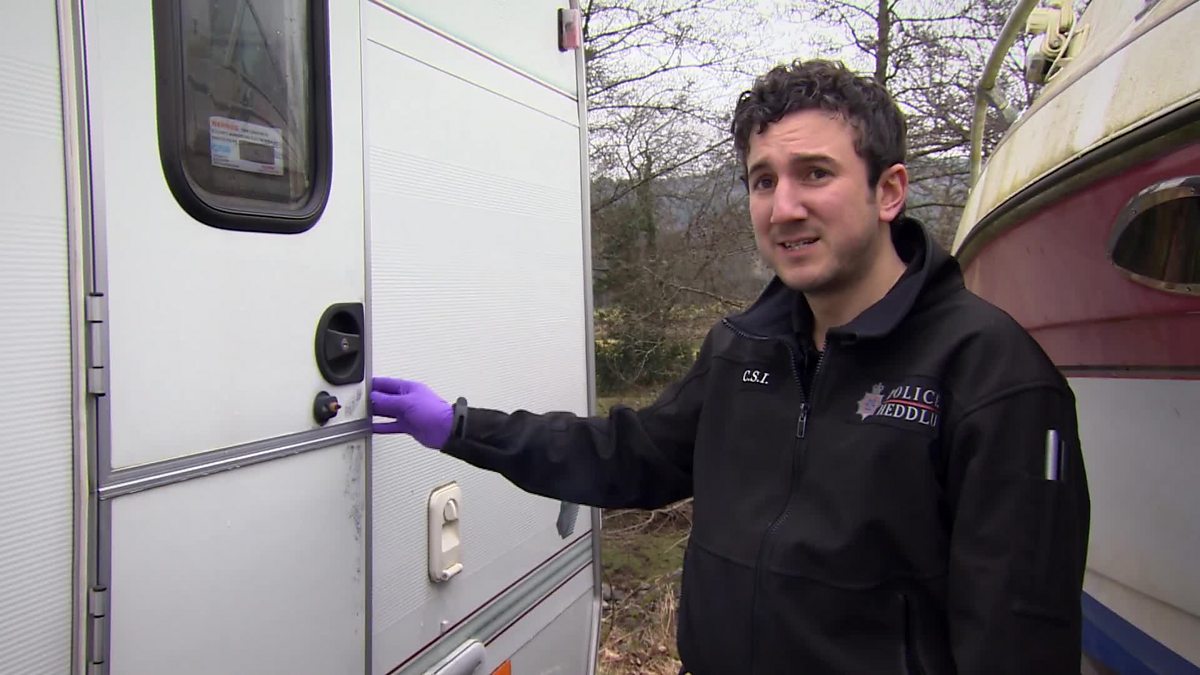 Police investigate caravan burglary and take away box of Viennese whirls for forensic testing.
