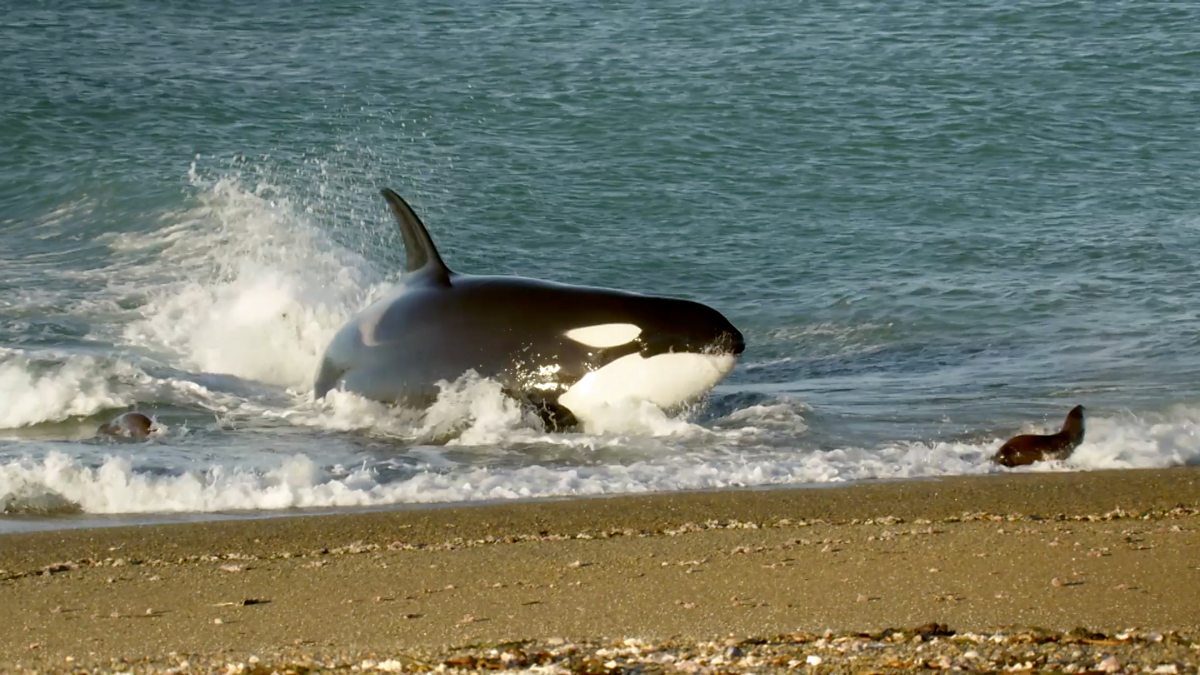 Amazing first time aerial images of orcas hunting sea-lions pups reveal their technique - keeping fins low and using the waves to hit the beach.