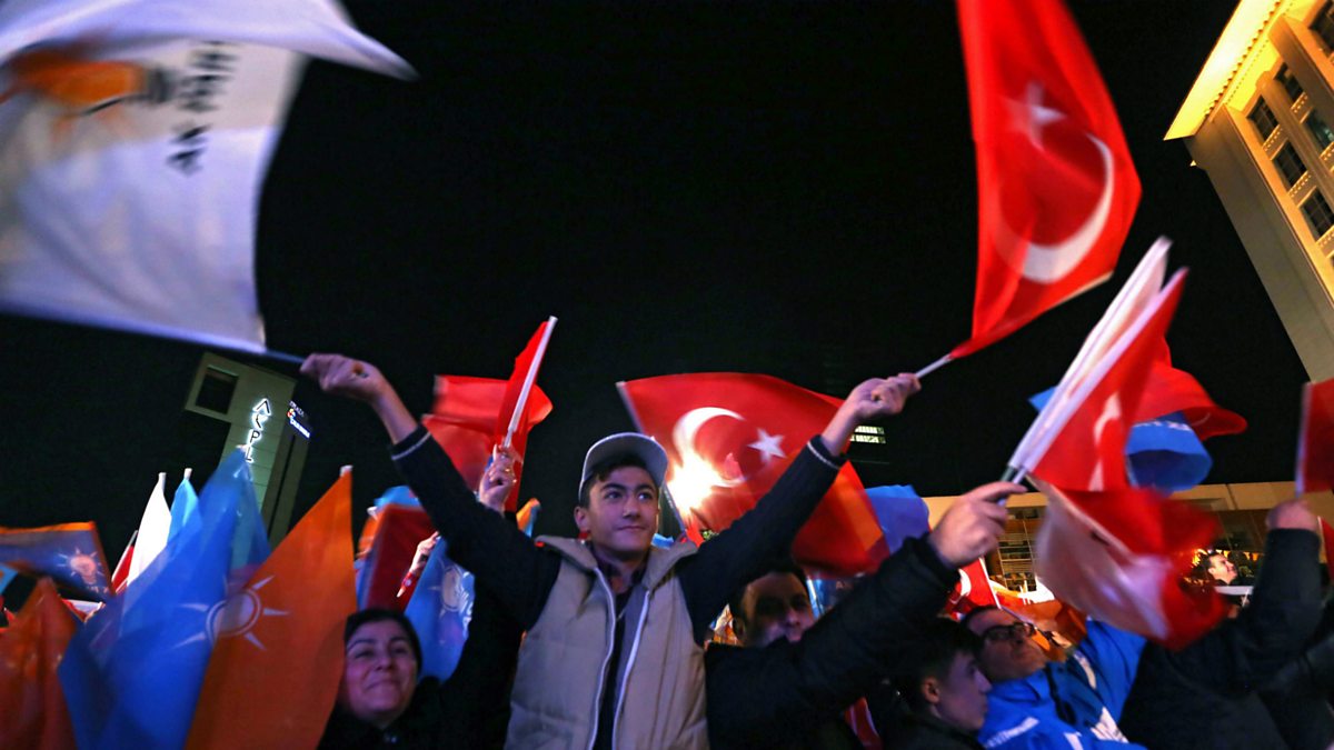 (Photo: Supporters of Justice and Development Party (AKP) celebrate after hearing early results of general elections in front of party's Ankara HQ. Credit: EPA)