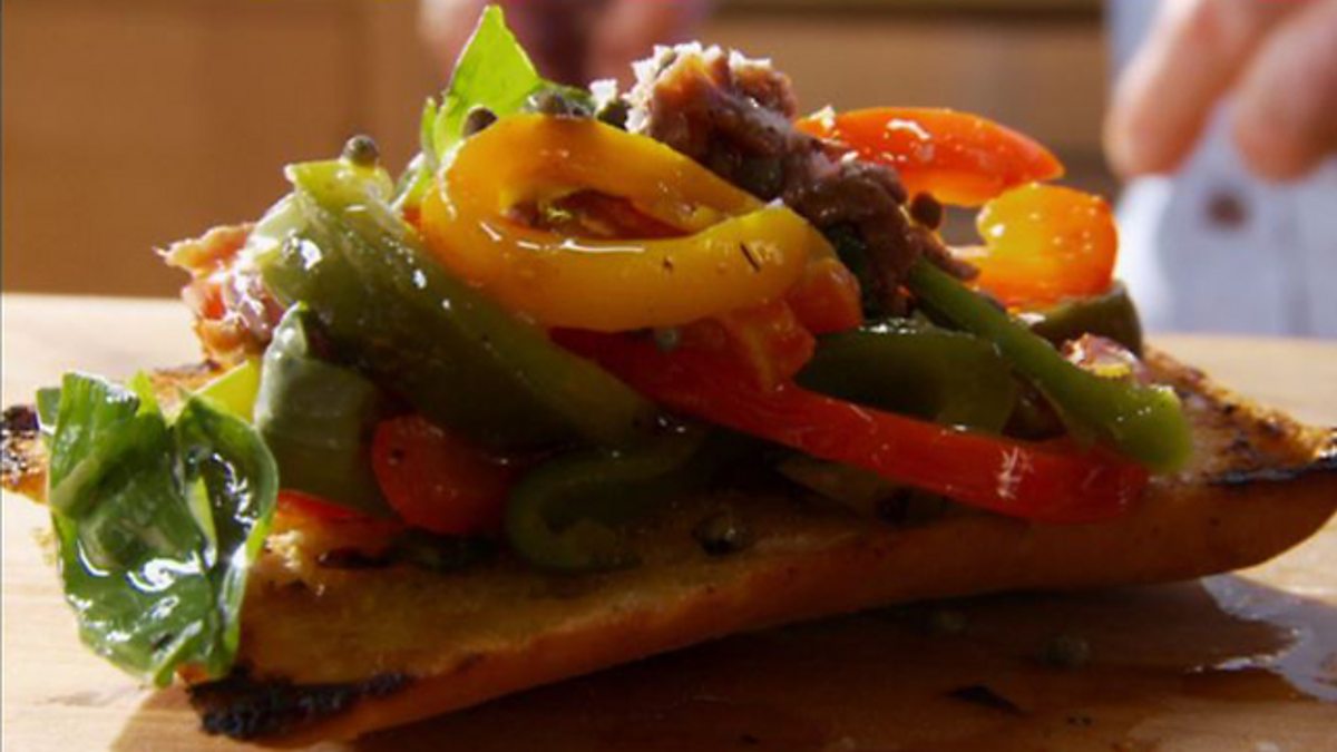 Belfast chef Éamonn Ó Catháin cooks Char-grilled mixed peppers with basil, anchovy and capers, served with garlic bruschetta.