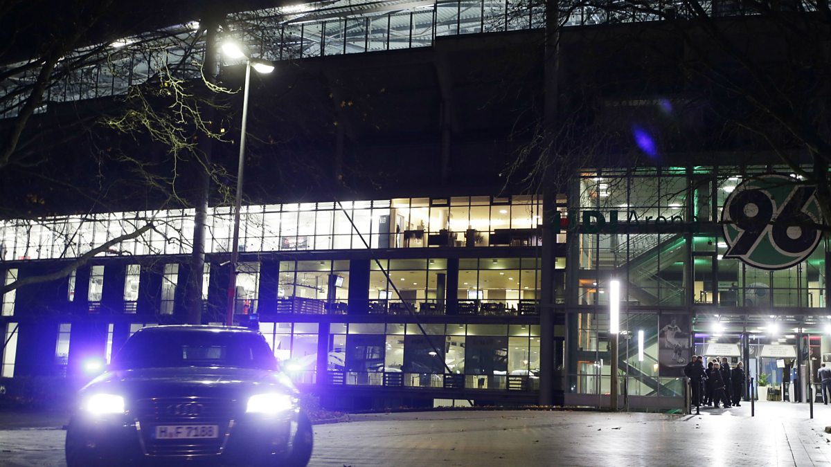 (Photo: A police car stands in front of the Hannover football stadium. Credit: AP)