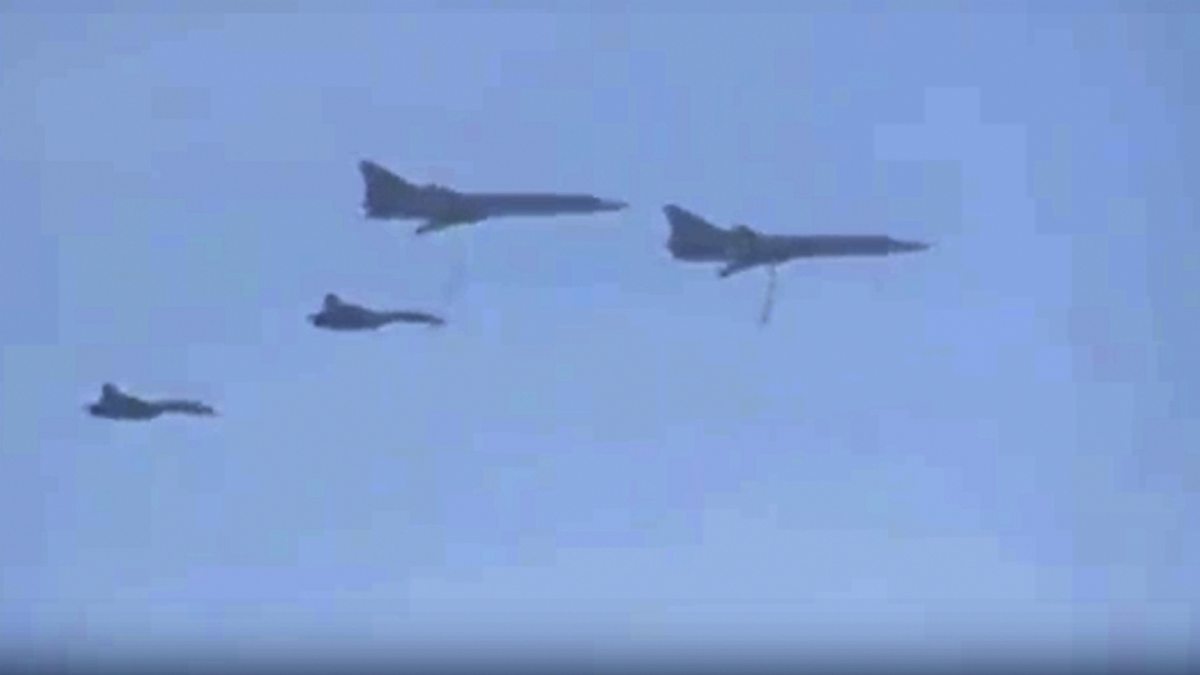 (Photo: Russian Tu-22 bombers escorted by the Su-27s fighter jets drop bombs on a target in Syria. Credit: AP/ Russian Defence Ministry Press Service)