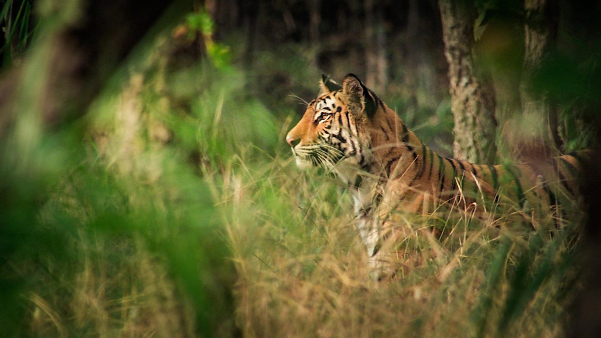 A tiger, the world's largest forest predator, uses the noises and darkness of a storm to get within striking distance of deer in India.