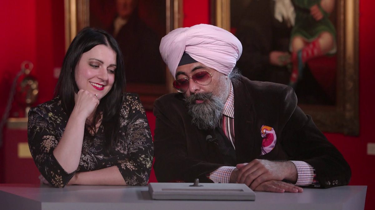 Lars and Helen try to outwit Nina and Hardeeep in the Question of Attribution round at Stirling Smith Museum, Scotland.