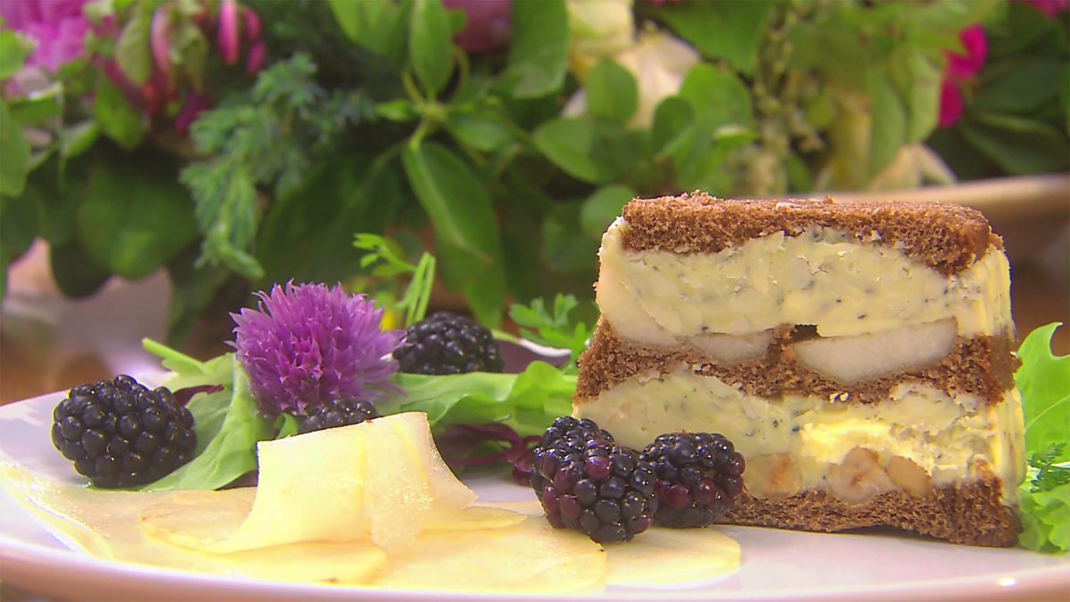 Veda bread and blue cheese terrine with local pears and hazelnuts