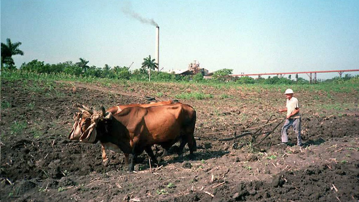 (Photo: Due to severe fuel shortages in the 1990s, a Cuban peasant is forced to use oxen instead of a tractor to plow a cane field (Credit: AFP/Getty Images)