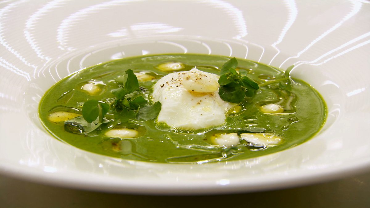 Marcus Wareing demonstrates his skills test. He wants the chefs to make the perfect watercress soup and finish it with a poached egg and fresh almonds.