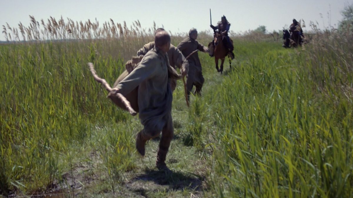 Priests run to escape the pursuing Vikings on horseback in the marshland.