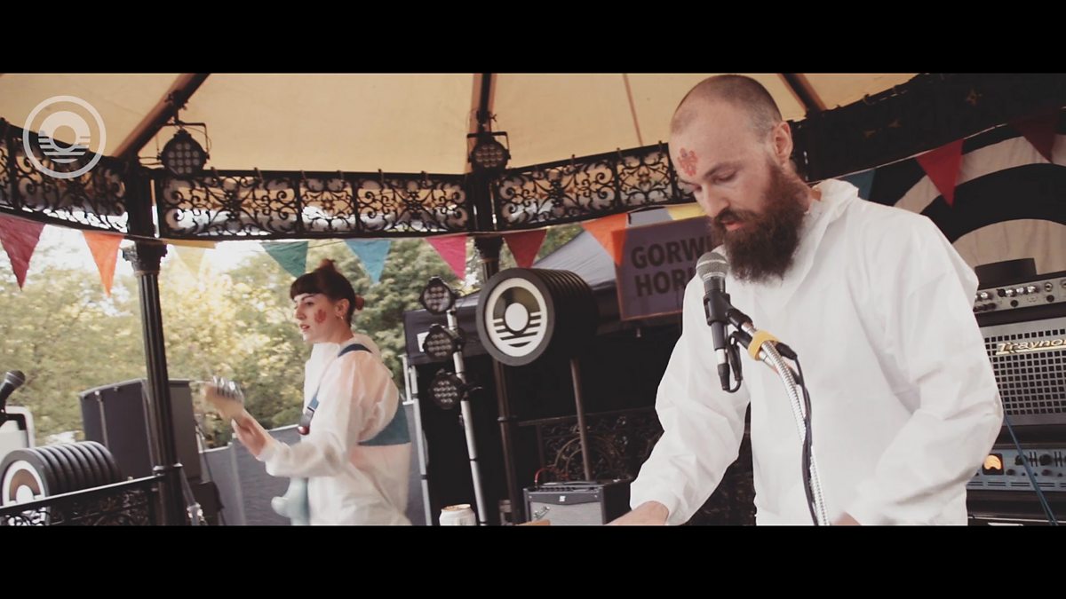 Y band ar lwyfan y ‘bandstand’ eleni yn yr ŵyl ym Mhortmeirion.