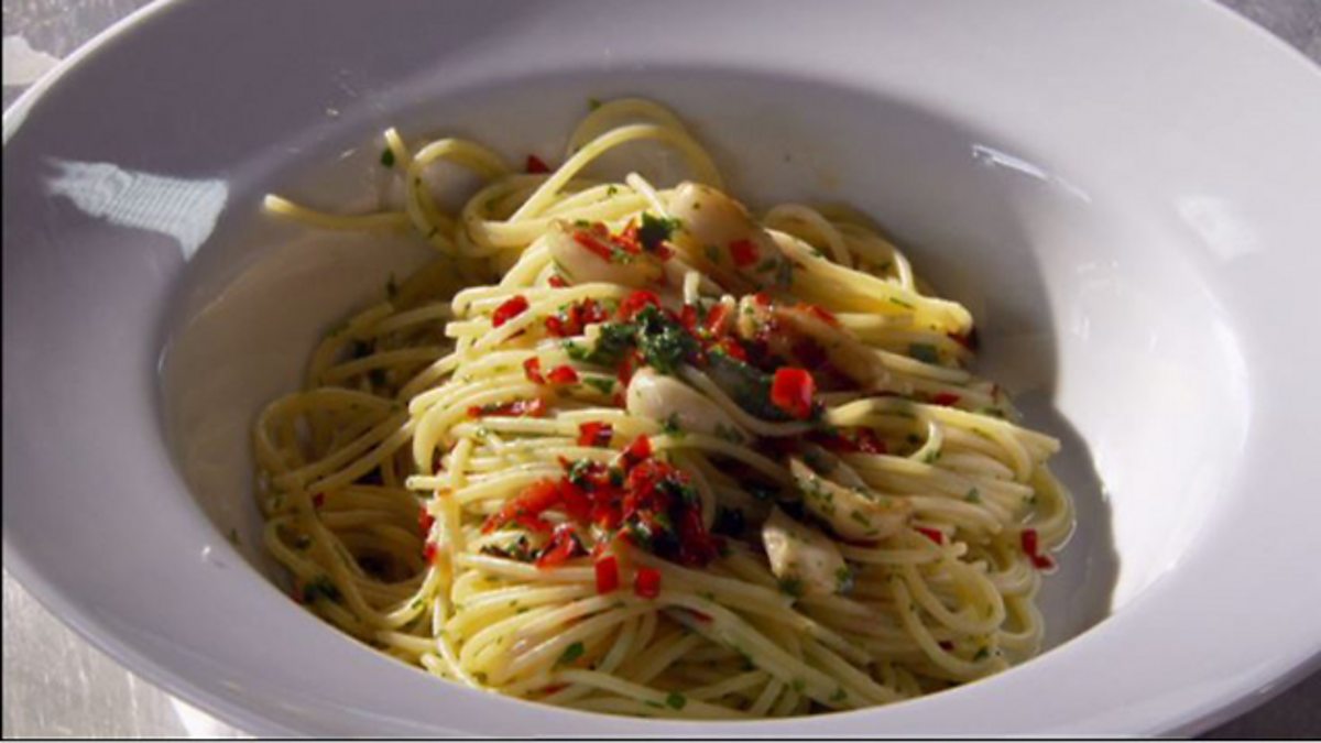 Put the garlic back in the pan with the chilli & add some more olive oil. Using tongs, transfer the pasta to the pan with the chilli, olive oil and garlic. Sprinkle with a little chopped parsley, add a few tablespoons of the water in which the pasta was cooked, adjust the seasoning and then transfer to hot plates.