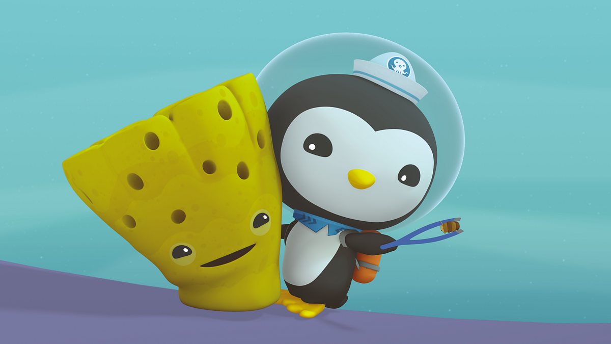 Mae'r Octonots yn canu cân am y sbwng môr. The Octonots sing a song about the sea sponge.