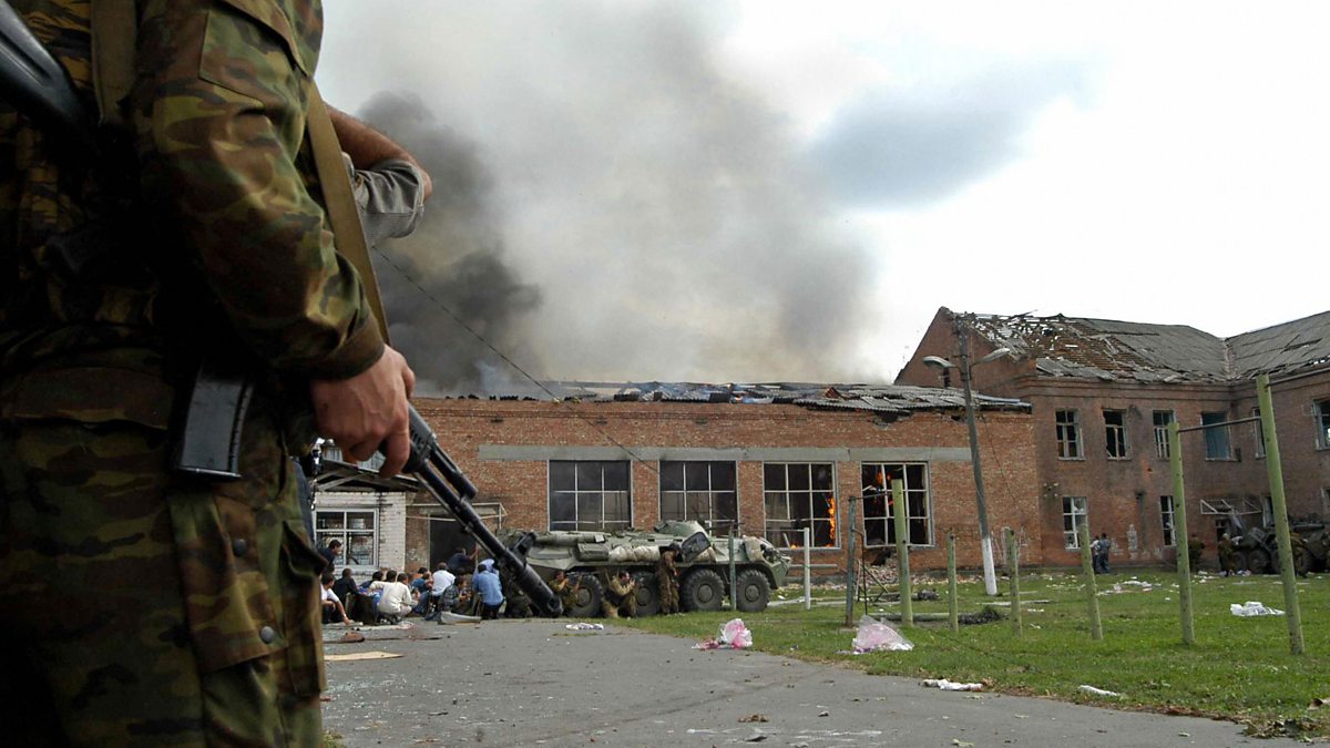 Image: Soldiers and security forces in front of the burning school in Beslan, North Ossetia on September 3, 2004. Photo credit: Yuri Tutov / AFP / Getty Images