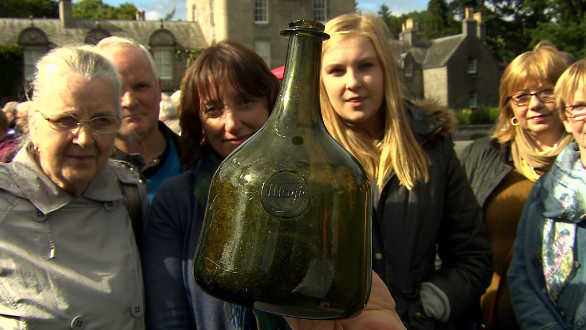 Glass expert, Andy McConnell, examines a recently unearthed 1740s, wine bottle