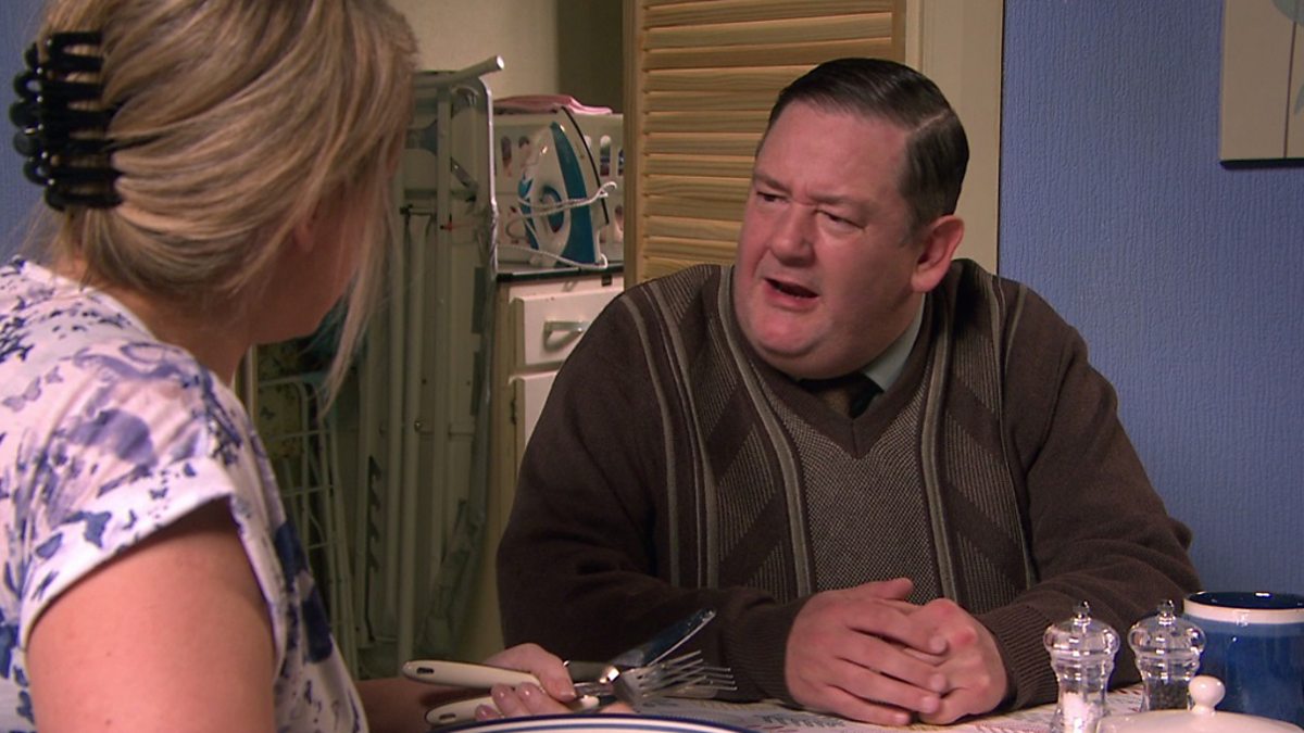 Eric (Johnny Vegas) ponders the mysteries of love over a bit of boiled ham. Cath (Sally Lindsay) isn't quite so tuned in to the romance.