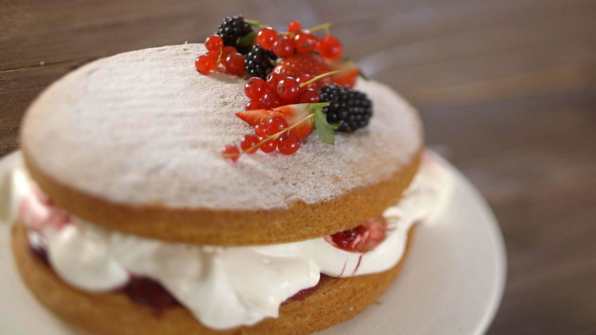 This fancy Victoria sponge is filled with fresh cream and syrup-coated berries for a special teatime treat.