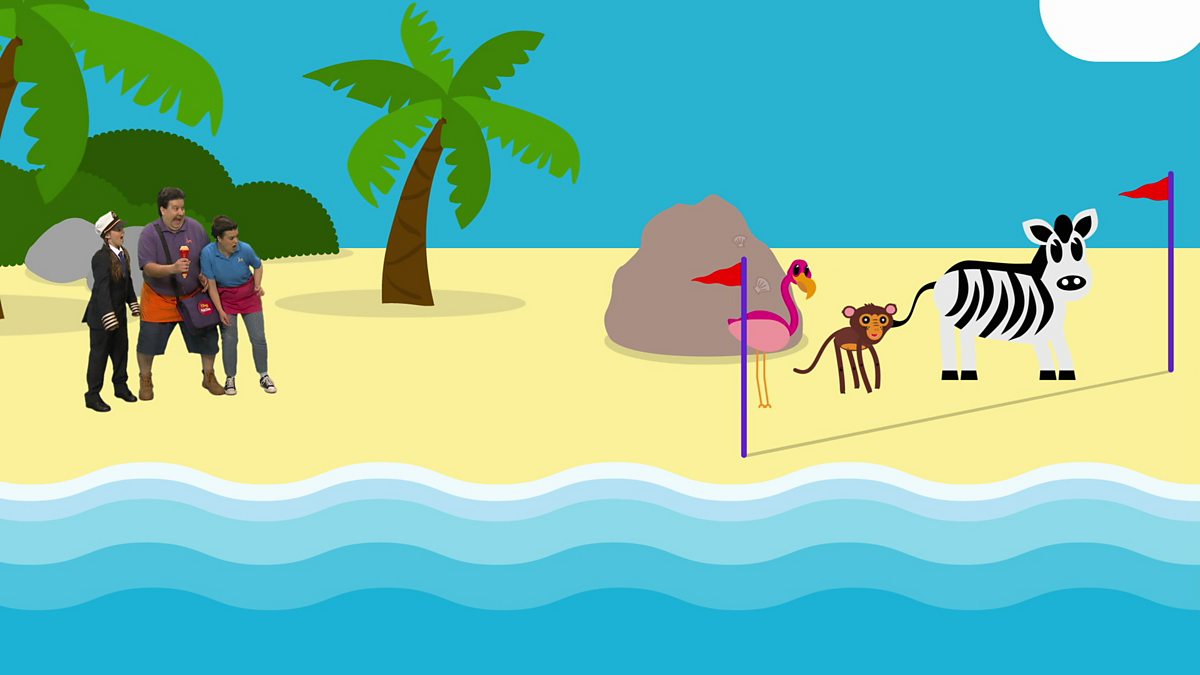 Mae 'na ras fawr yn digwydd ar y traeth heddiw rhwng Sebra, Fflamingo a Mwnci ac mae pob un yn siwr y byddant yn ennill! It's race day and Zebra, Flamingo and Monkey each want to win!
