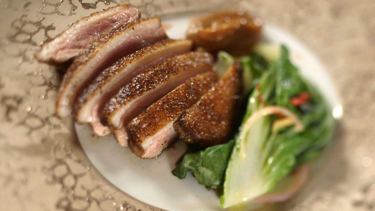 Duck breast with umeboshi sauce and steamed bok choi