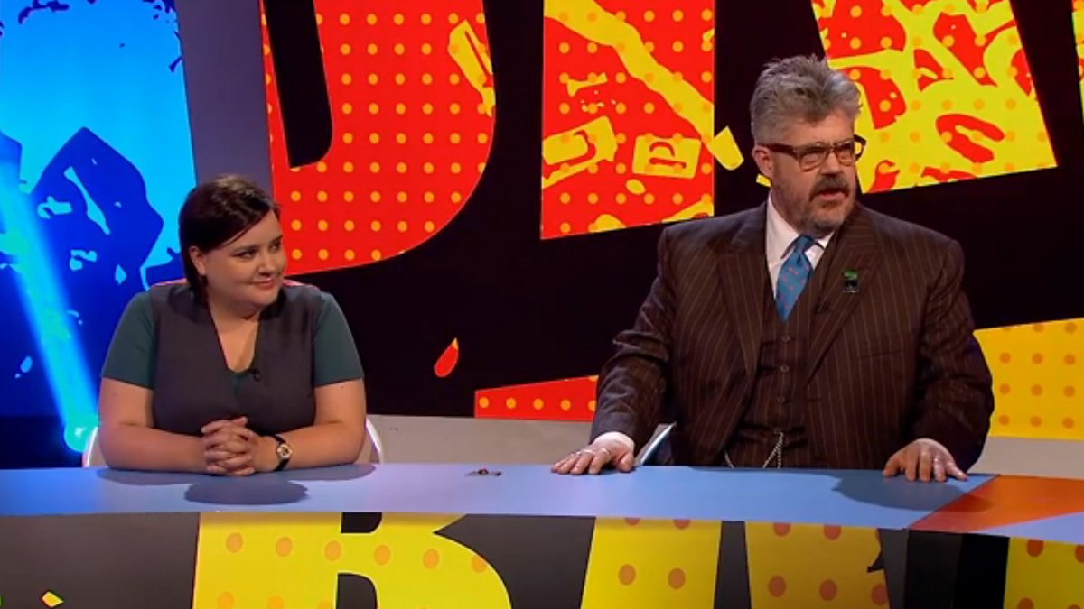 Patrick Kielty hits his buzzer. Phill Jupitus questions why the host needs a buzzer!