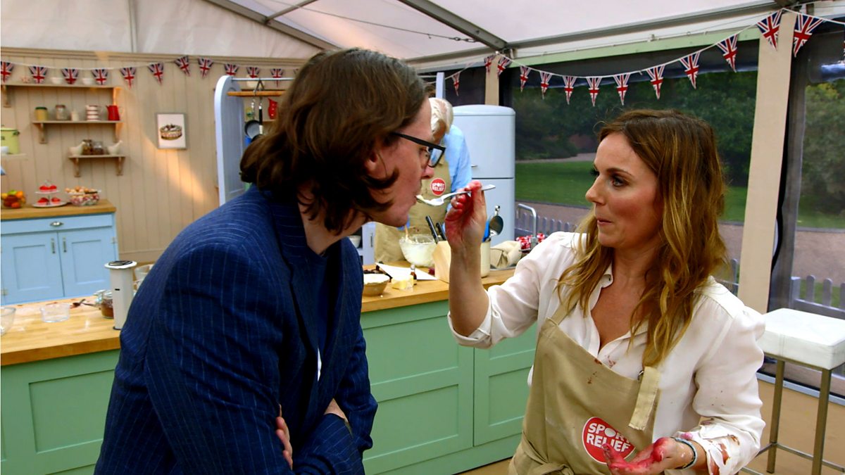 Ed Byrne offers some sounds advice as the Sport Relief celebrity bakers struggle to smooth out lumps in their buttercream icing.