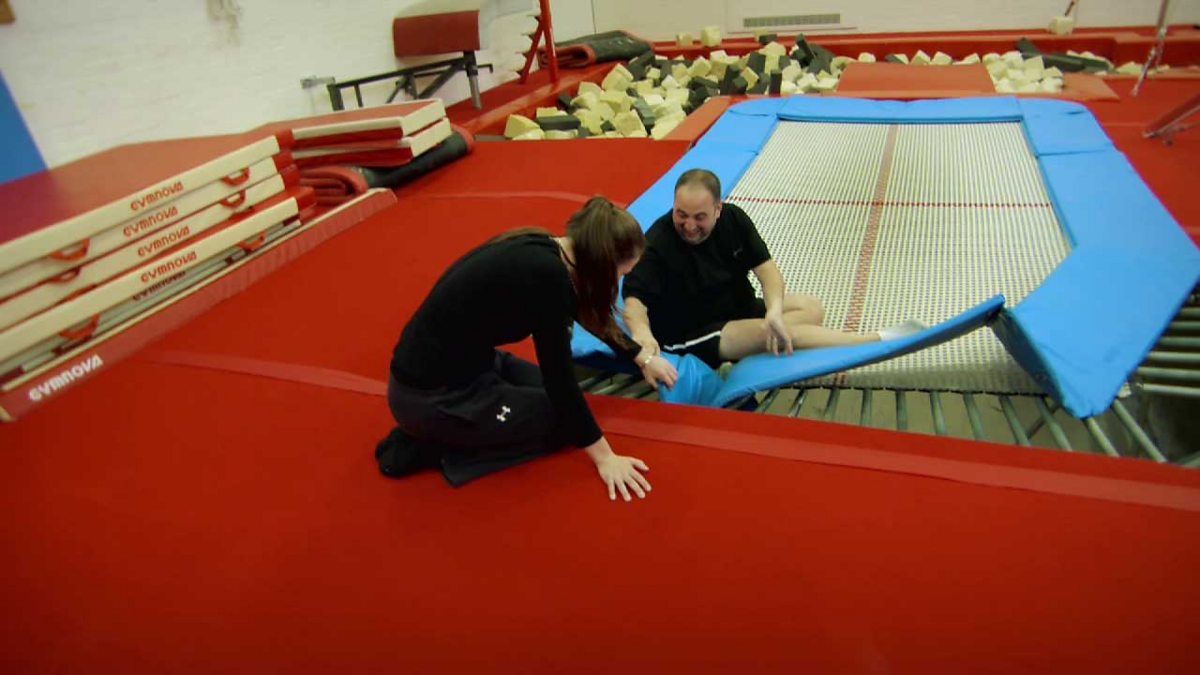 Wynne has a trampoline lesson with Frankie Jones. He survives but does the trampoline?
