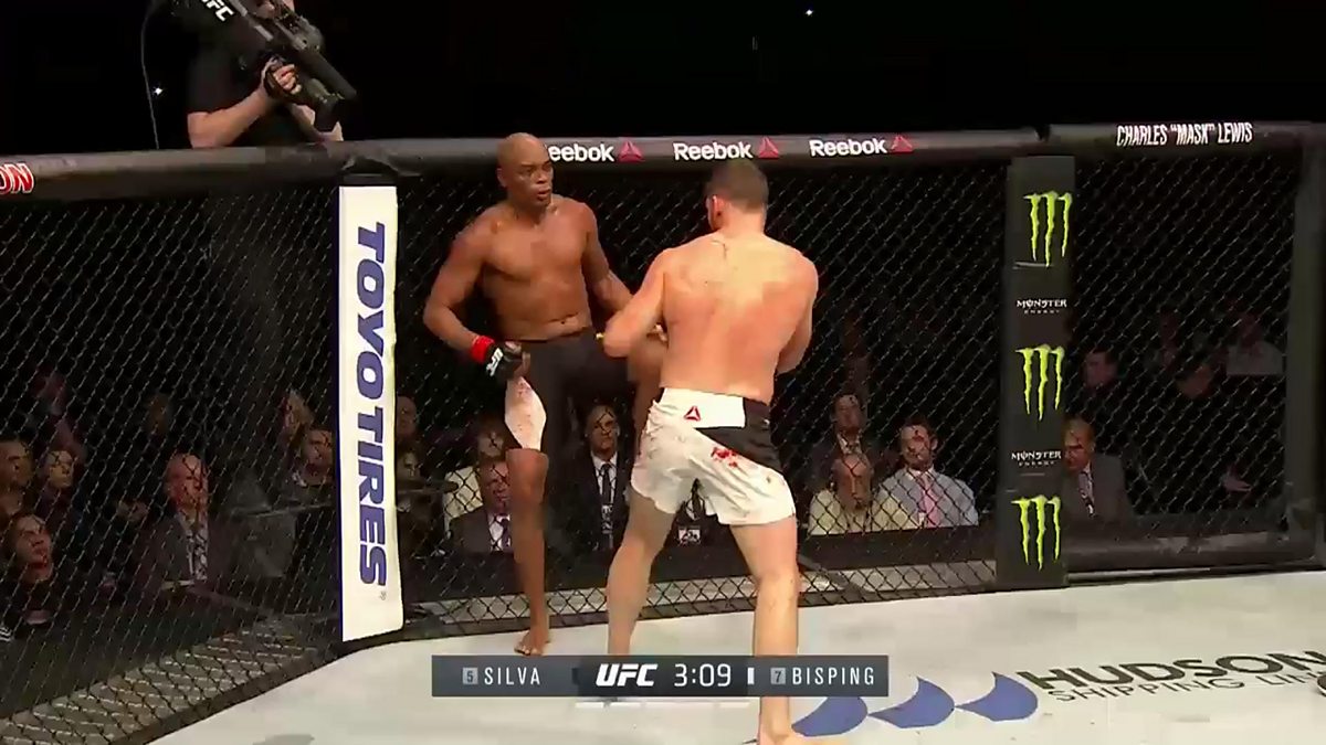 Anderson Silva lands a huge kick on Michael Bisping in the fifth round.