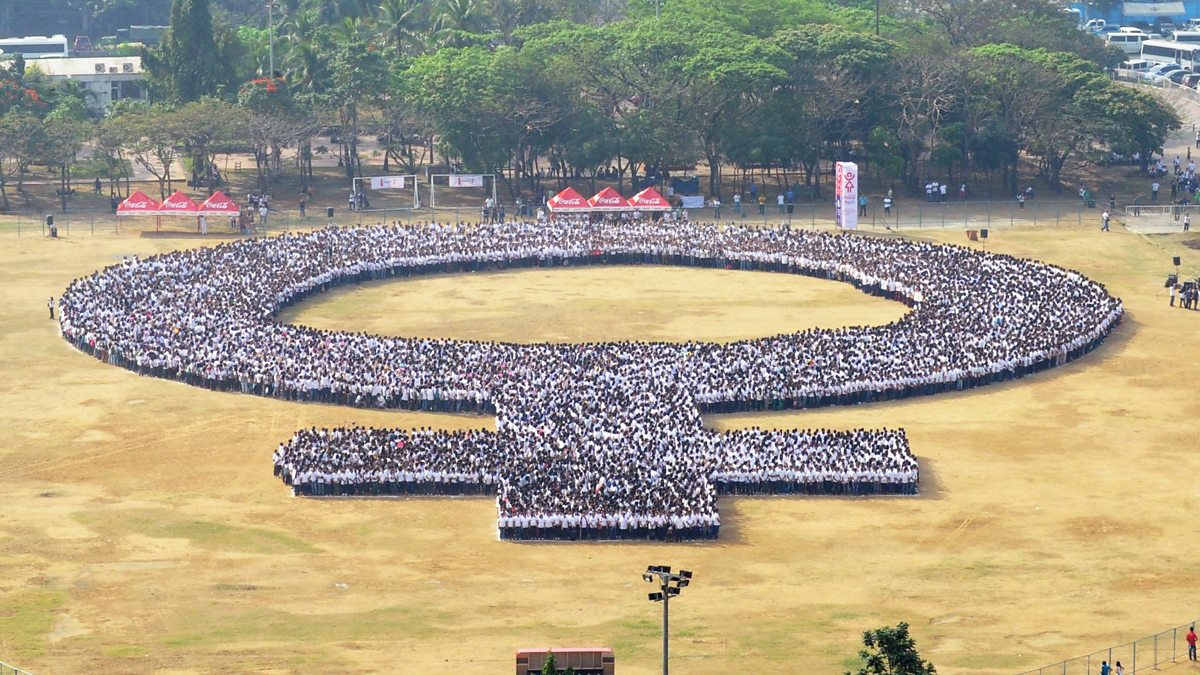 (Picture: People gathered to form a woman symbol to celebrate International Women's Day at in Manila, Philippines; Credit: Jay Directo/AFP/Getty Images)