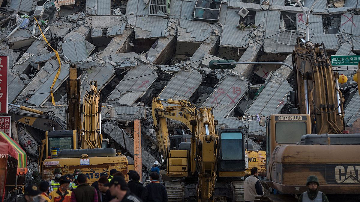 (Photo: A general view shows excavator vehicles and rescue workers in front of a building which collapsed in the 6.4 magnitude earthquake, in the southern Taiwanese city of Tainan early on 9 February, 2016. Credit: Getty Images)