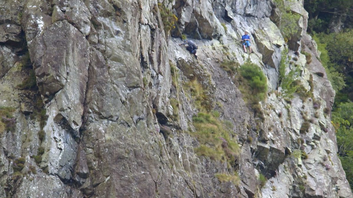 Chris Hollins is assisted by world class climber and local lad, Leo Holding.