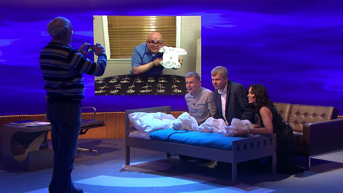 After making their elephant origami towels, Christine asks a member of the audience to take a photo of them all for her Instagram feed.
