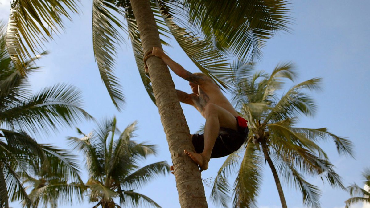 Iwan Thomas and James Toseland learn to climb a coconut tree. Iwan climbs to the top of the tree with ease, but coming down is less graceful.